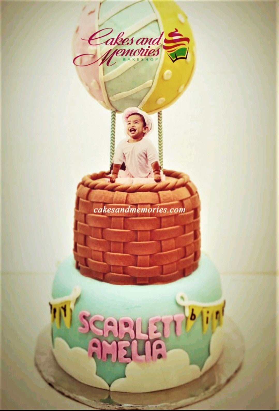 Two-tier hot air balloon themed cake with a basket-weave top tier, light blue bottom tier with clouds, and a photo printout of a baby.