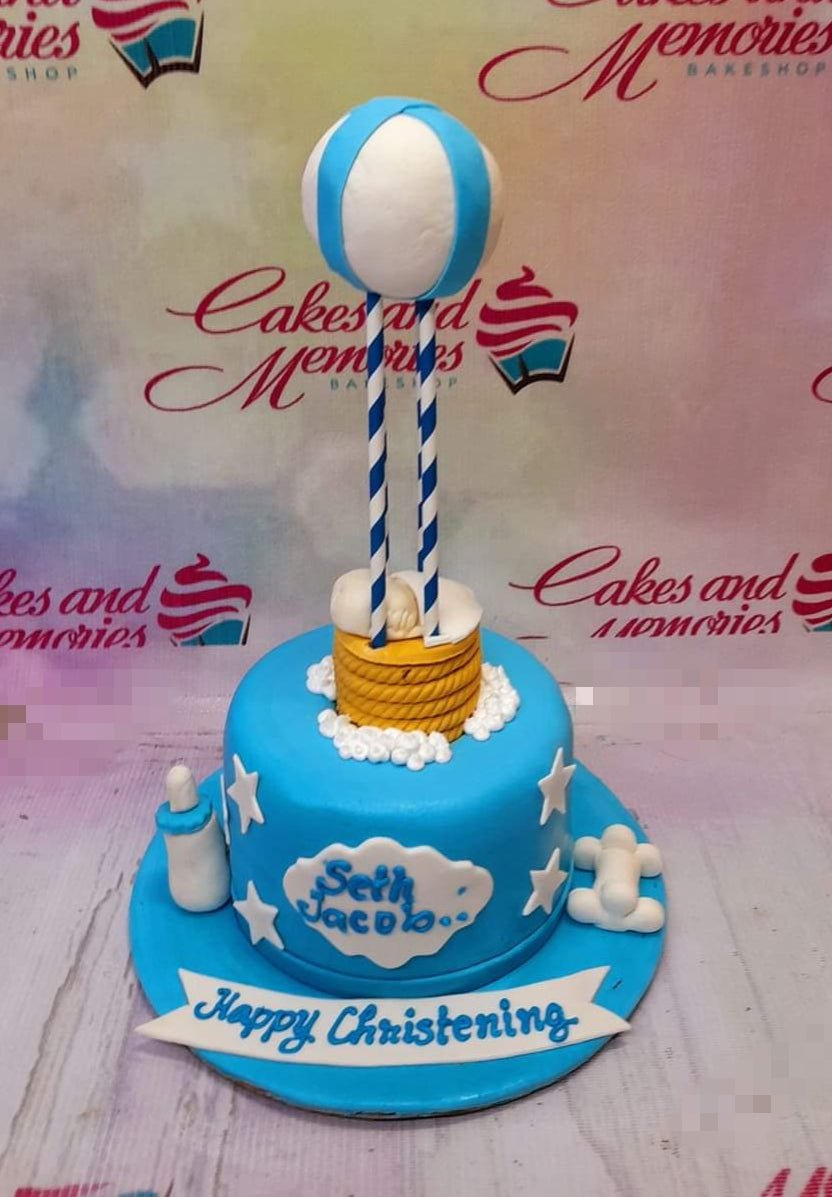Blue hot air balloon christening cake with a sleeping baby figurine, white clouds, and stars on a blue fondant base.