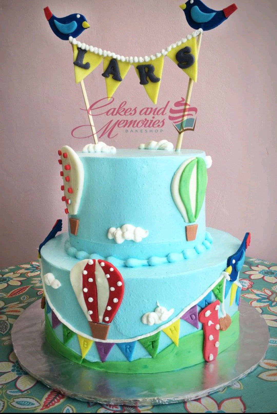 Two-tier light blue hot air balloon themed birthday cake with colorful bunting, clouds, and bird toppers.