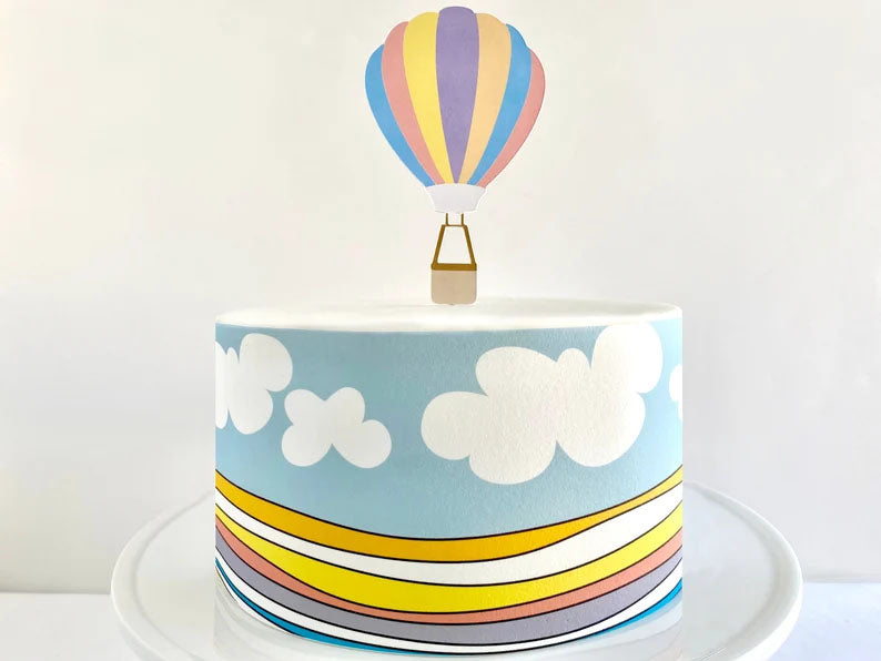 A minimalist light blue cake featuring a hot air balloon printout topper and a side wrap with white clouds and colorful stripes.
