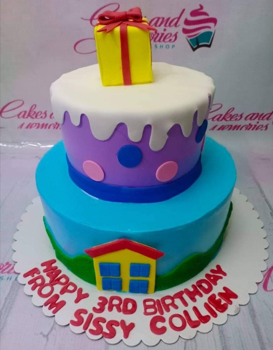 Two-tier colorful fondant cake with a yellow gift box topper, a yellow house decoration, and a purple tier with pink and blue polka dots.