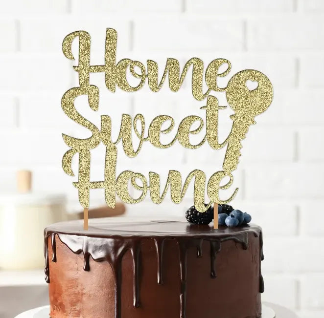 Chocolate drip cake with a gold glitter Home Sweet Home topper and fresh berries.