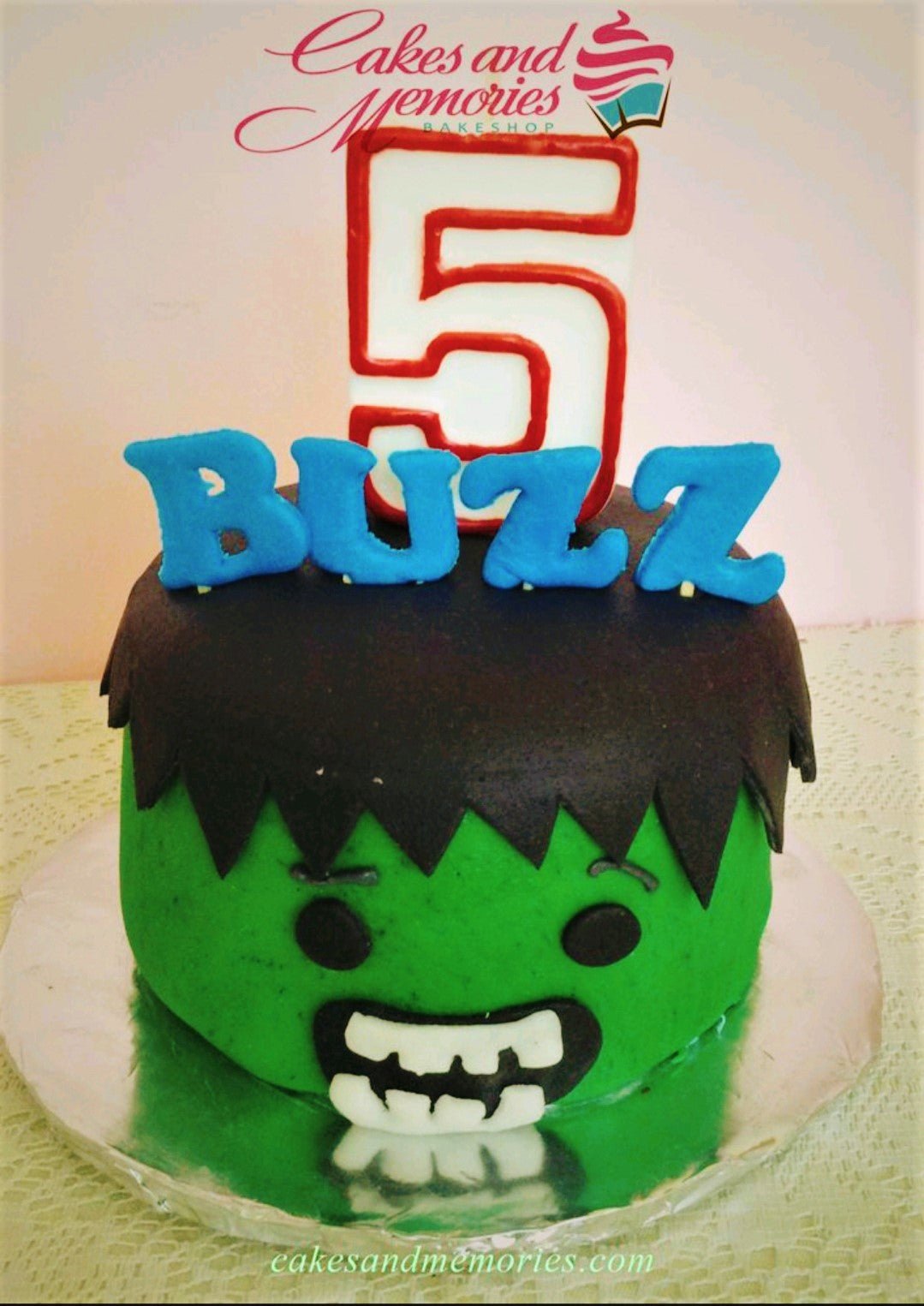Green Hulk-themed fondant cake with a large number 5 topper and blue gumpaste letters spelling BUZZ.