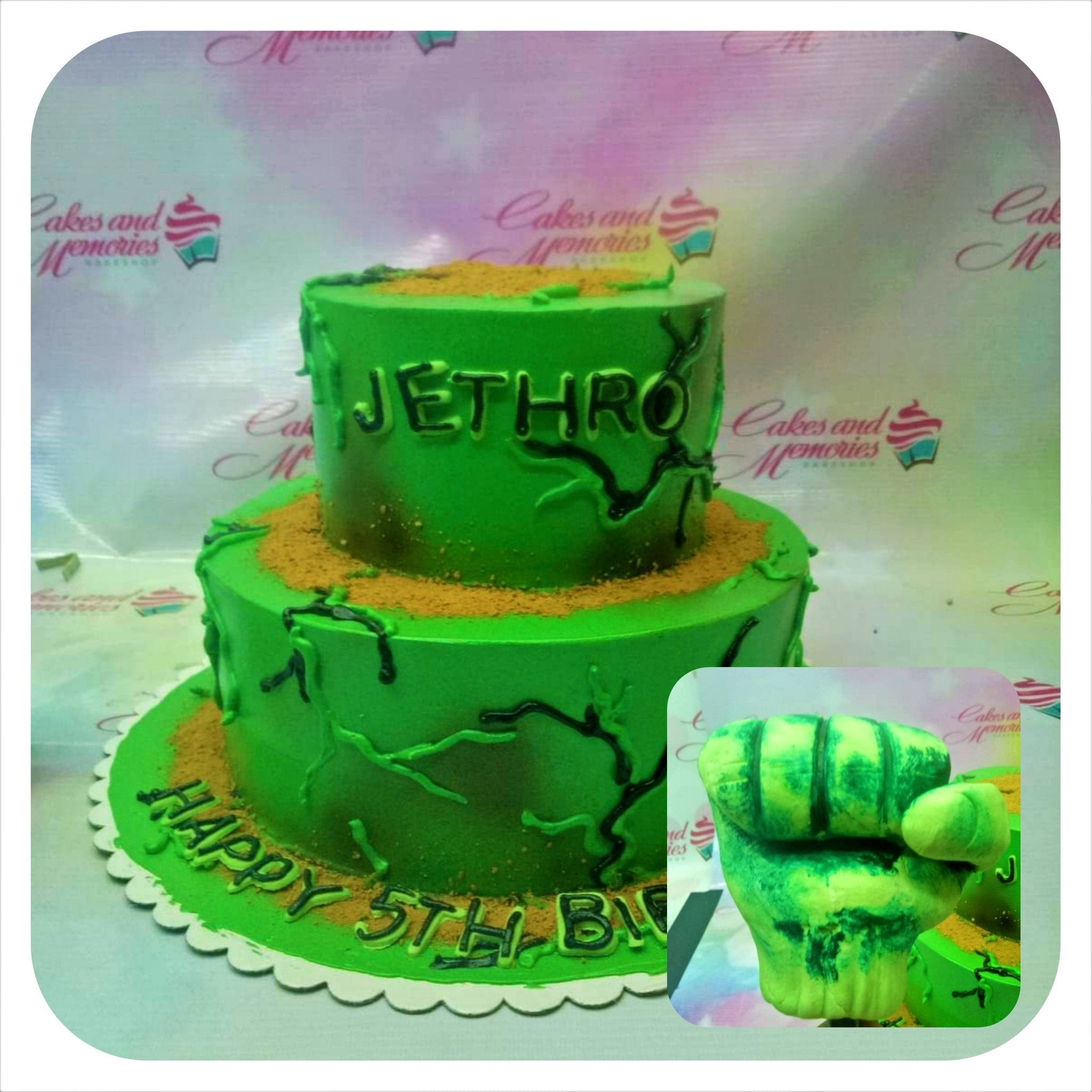 Two-tier green Hulk-themed birthday cake with a large green fist topper and brown crumb accents.