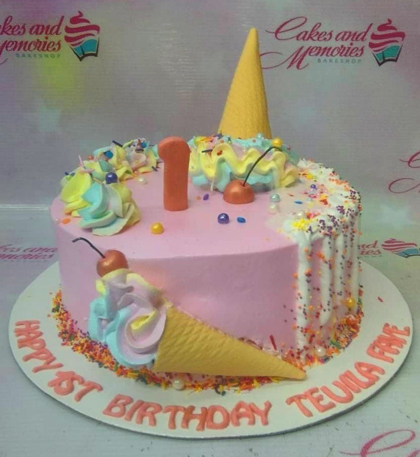 Pink ice cream themed birthday cake with colorful icing swirls, sprinkles, and a number one topper.
