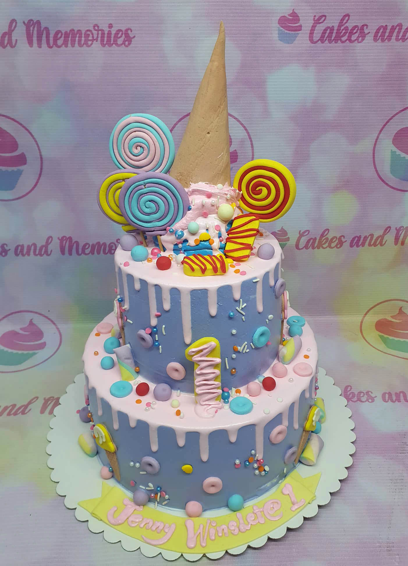 Two-tier purple ice cream themed cake with pink drip, lollipops, and an upside-down ice cream cone topper.