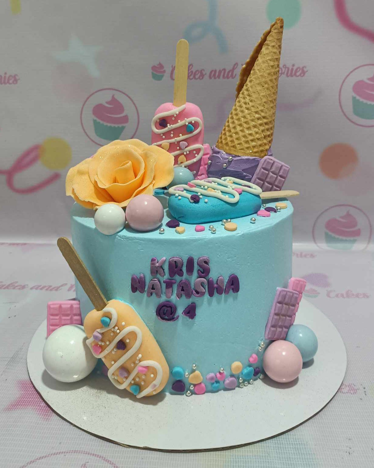 Light blue 1-tier birthday cake decorated with ice cream pops, a waffle cone, a yellow rose, and purple fondant letters.