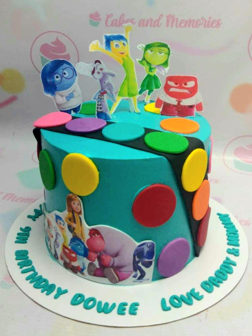 Teal Inside Out themed birthday cake with character printouts and colorful fondant circles