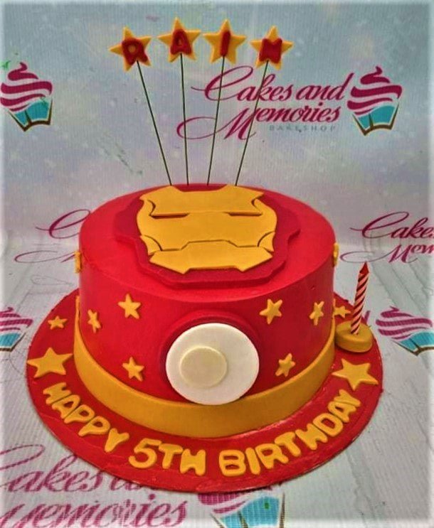 Red and yellow Iron Man themed birthday cake with a fondant mask on top and star decorations.