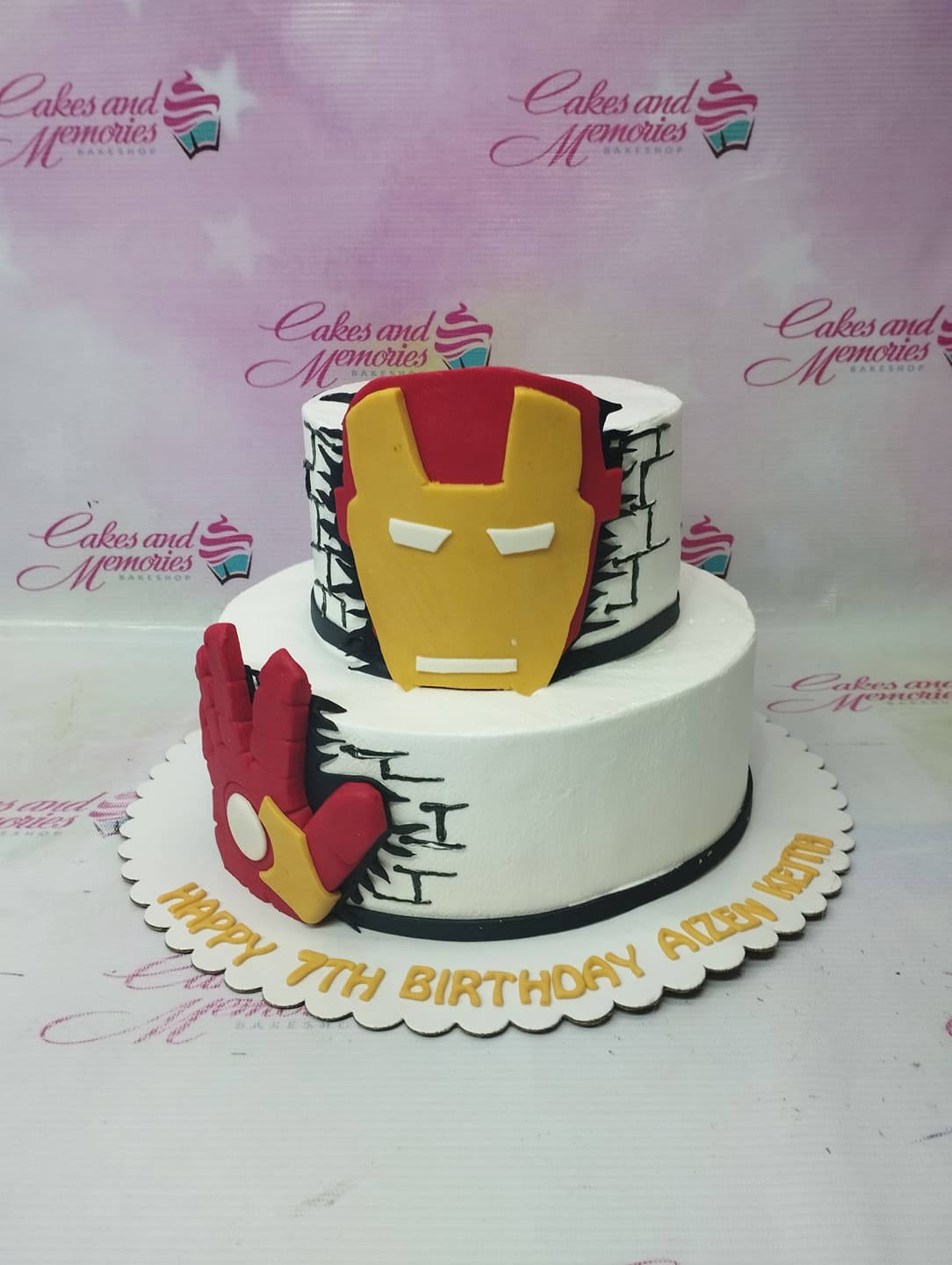 Iron Man themed 2-tier white cake with red and yellow fondant mask and hand toppers and black brick wall icing details.