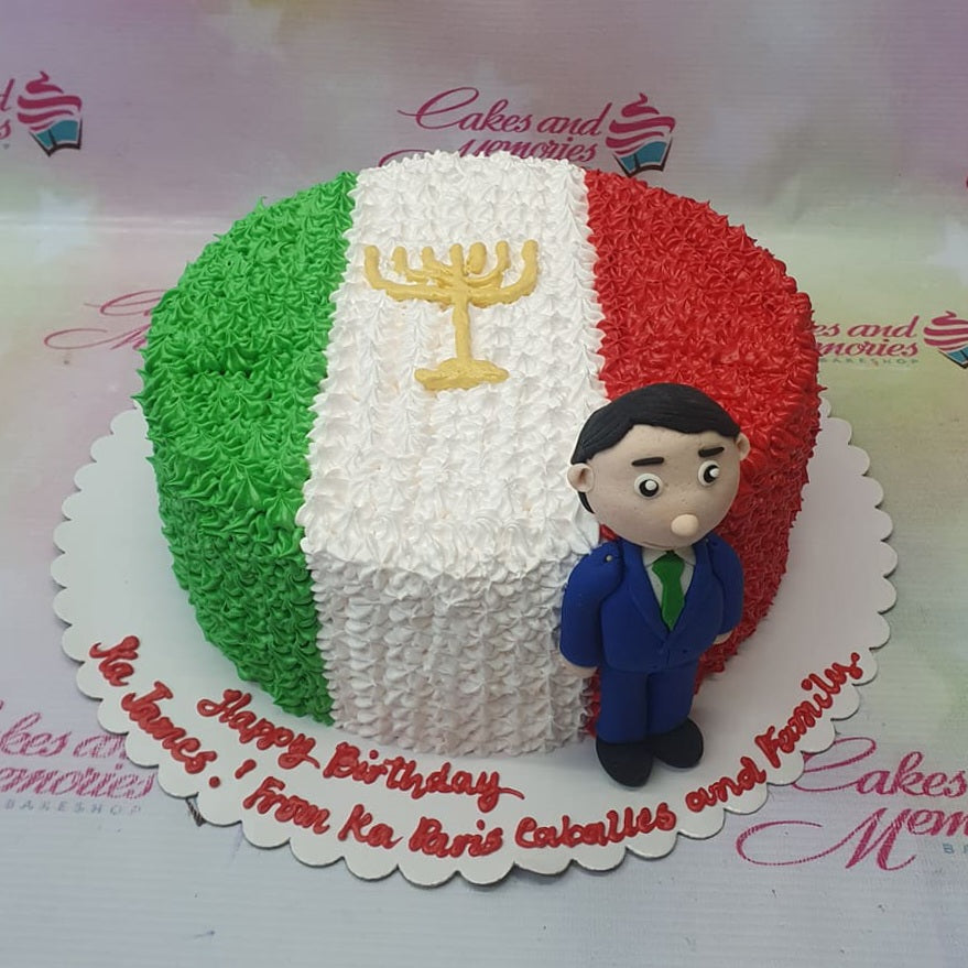 A round cake decorated with green, white, and red icing rosettes representing the Italian flag, featuring a gold menorah and a fondant man figure.