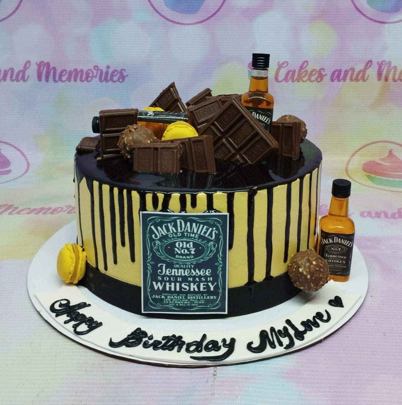 Jack Daniel's themed birthday cake with chocolate bars, yellow macarons, and mini whiskey bottles on a black and yellow drip cake.