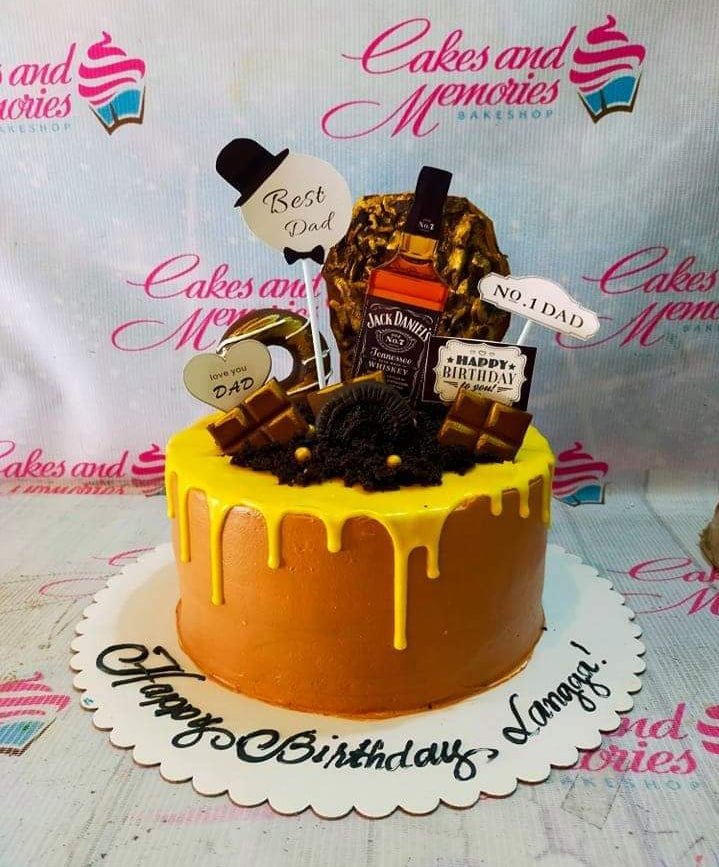 Brown and yellow drip cake for Dad with Jack Daniels bottle topper, chocolate bars, and Oreo cookies.