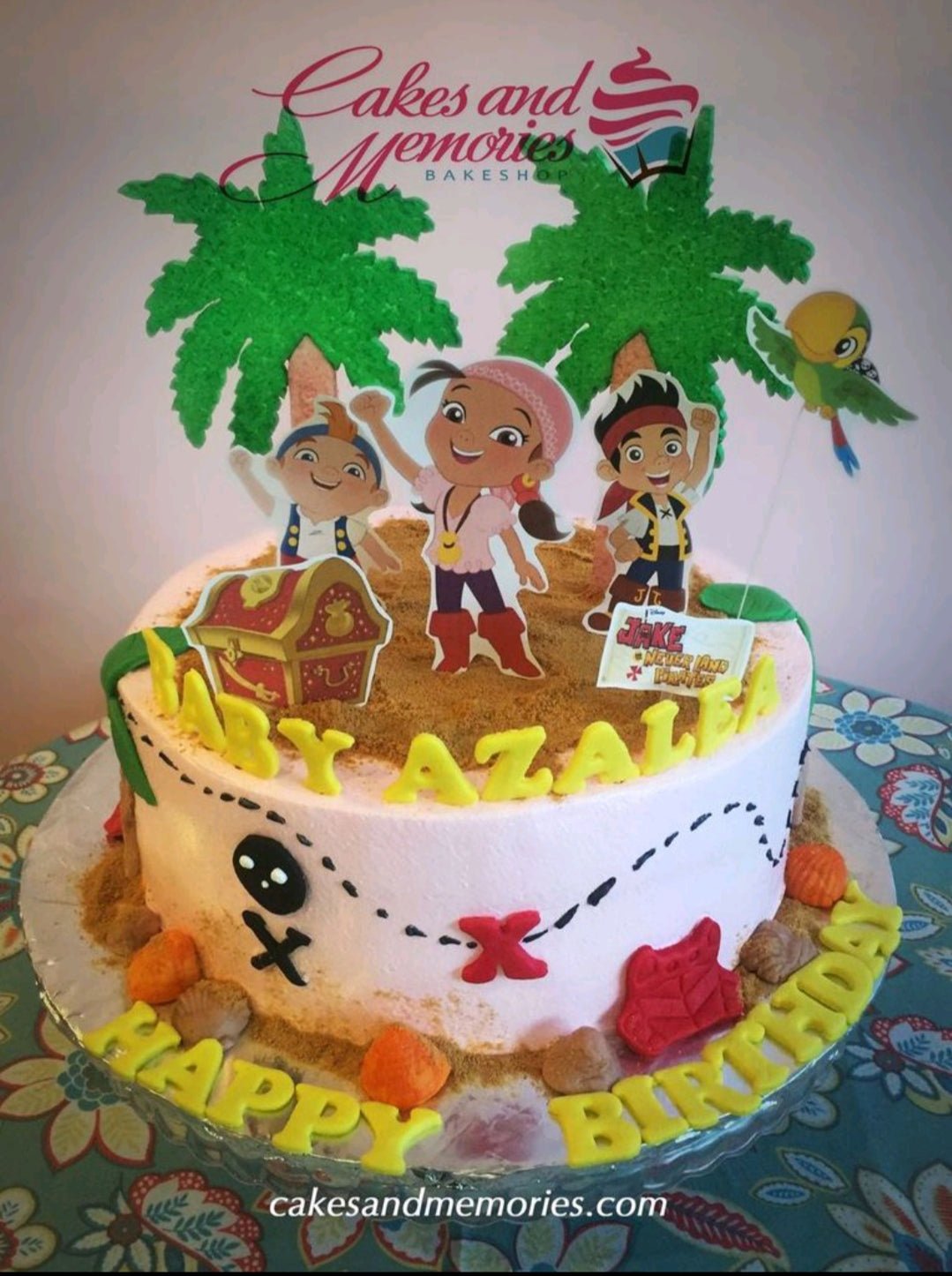 Jake and the Never Land Pirates themed birthday cake with character printouts, palm trees, and a treasure chest on a sandy icing base.