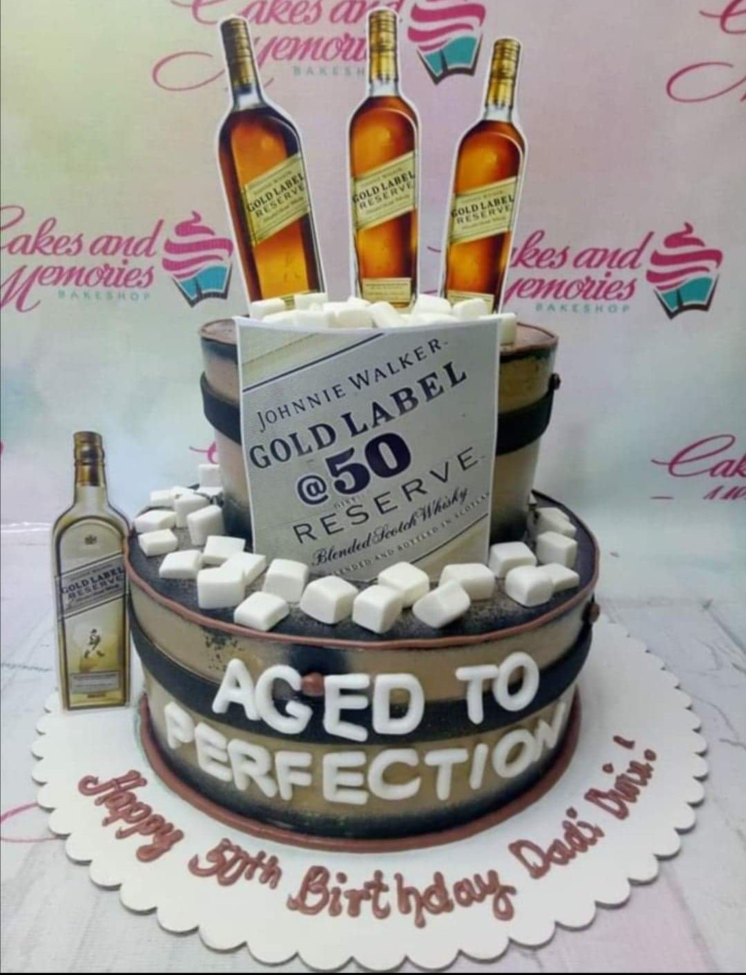 Two-tier Johnnie Walker Gold Label themed birthday cake with whiskey bottle printouts and white marshmallow ice cubes.