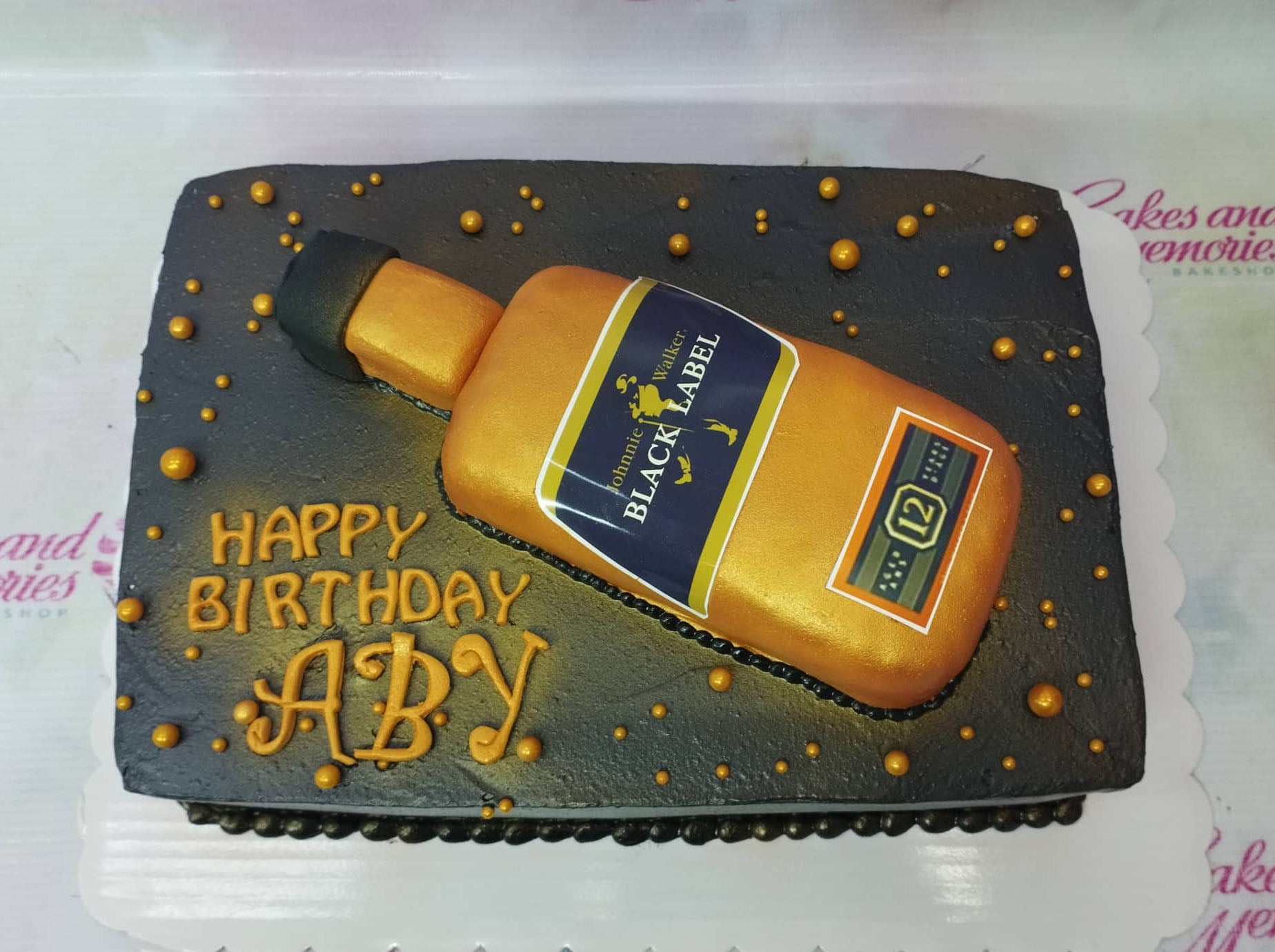 Black rectangle cake with a 3D fondant Johnnie Walker Black Label bottle and gold dragees.