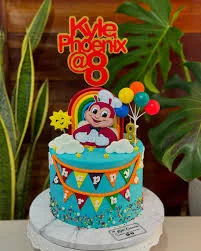 Blue Jollibee themed birthday cake with rainbow, balloons, and colorful bunting for Kyle Phoenix's 8th birthday.
