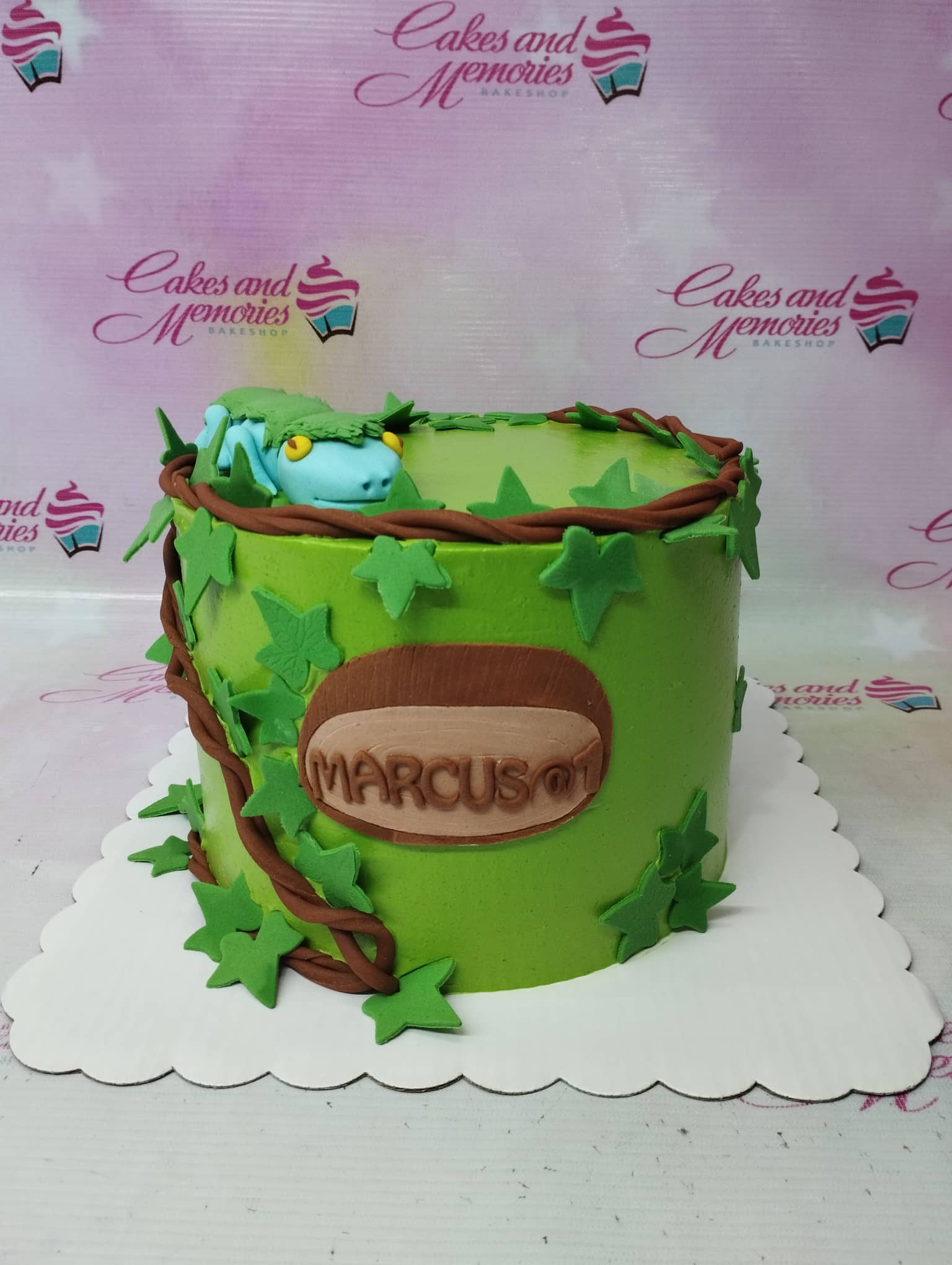 Green jungle themed cake with a 3D fondant lizard, brown vines, and green leaves for Marcus's 1st birthday.