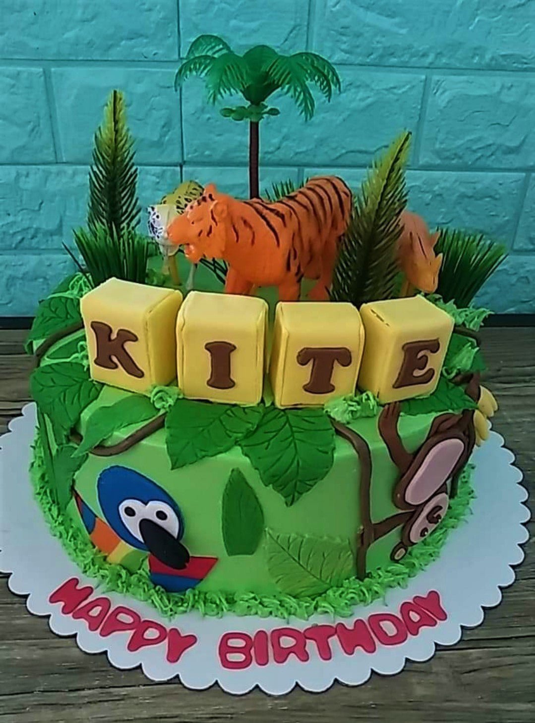 Jungle safari themed cake with 3D animal figures, palm trees, and fondant name blocks on a green icing base.