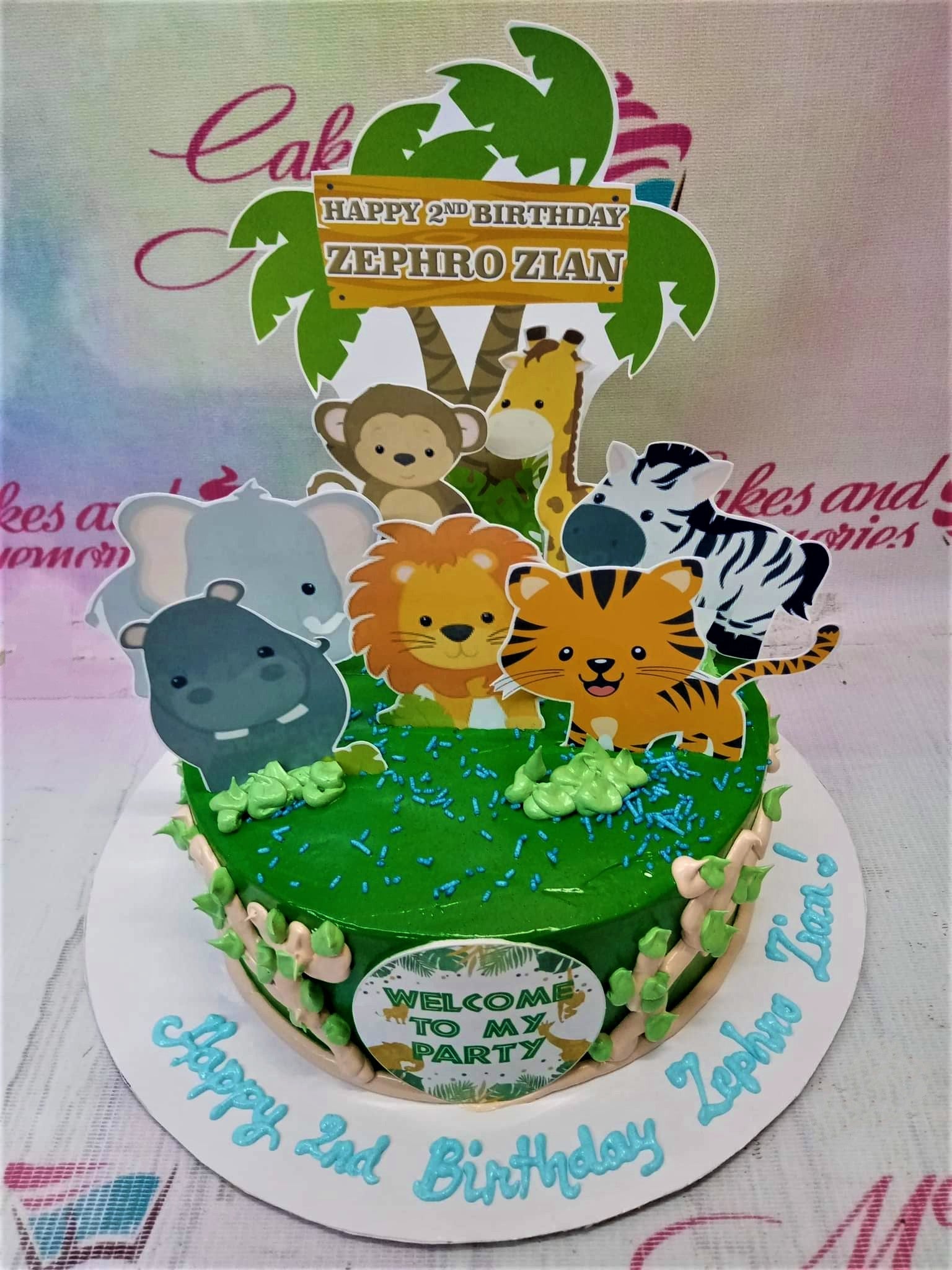 Green jungle safari themed birthday cake with animal printouts including a lion, tiger, elephant, and giraffe on a green icing base.