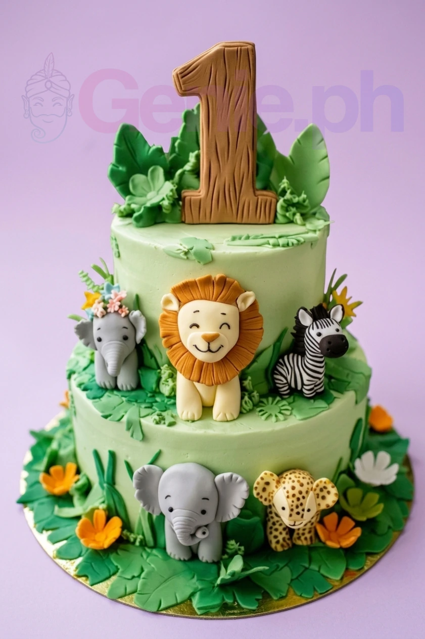 Jungle Safari 1st Birthday Cake | Custom 2-Tier Design Cake Design