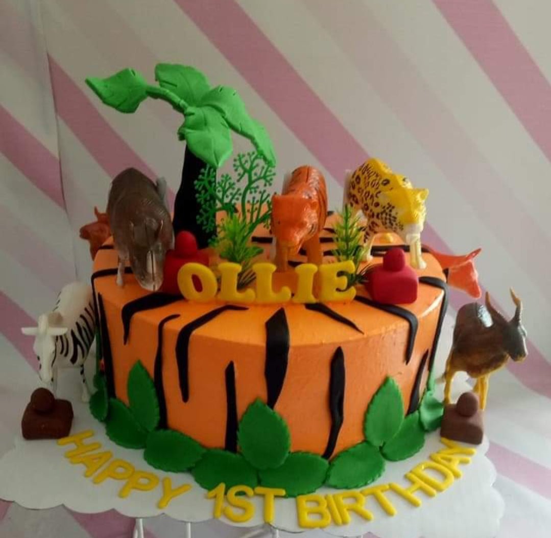 This vibrant 1-tier jungle safari birthday cake is perfect for a wild first birthday celebration. The cake features bright orange icing with hand-painted black tiger stripes and a lush border of green fondant leaves. It is decorated with various plastic animal toys including a zebra, tiger, leopard, and rhino, along with a fondant palm tree. The message 'OLLIE' is displayed in yellow gumpaste letters on top, with 'HAPPY 1ST BIRTHDAY' on the base board. This adventurous design is ideal for any young animal lover's special day. Order your custom celebration cakes through Genie.ph for delivery in Cebu City, Mandaue, and Lapu-lapu City.