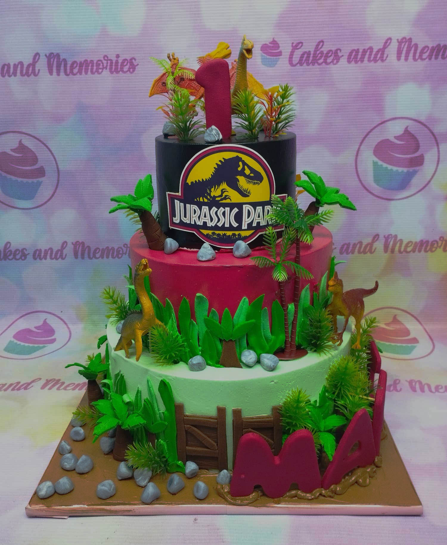 Three-tier Jurassic Park themed birthday cake with dinosaur toys, palm trees, and a large red number one topper.