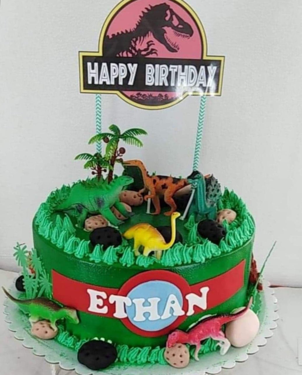 Green Jurassic Park themed dinosaur birthday cake with plastic dinosaur toys, palm trees, and a custom Ethan name banner.