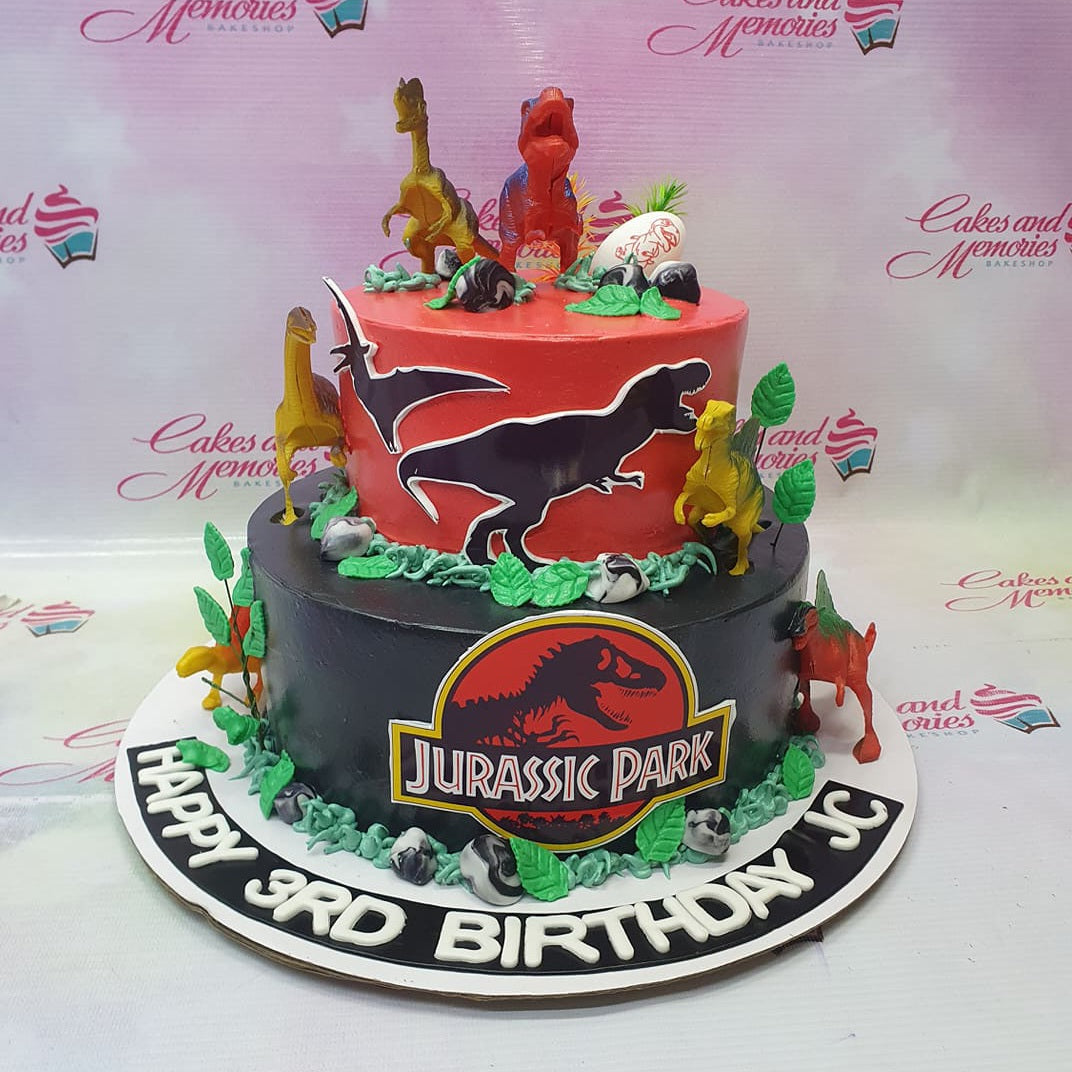 Two-tier Jurassic Park themed birthday cake with red and black icing, dinosaur toys, and a Jurassic Park logo printout.