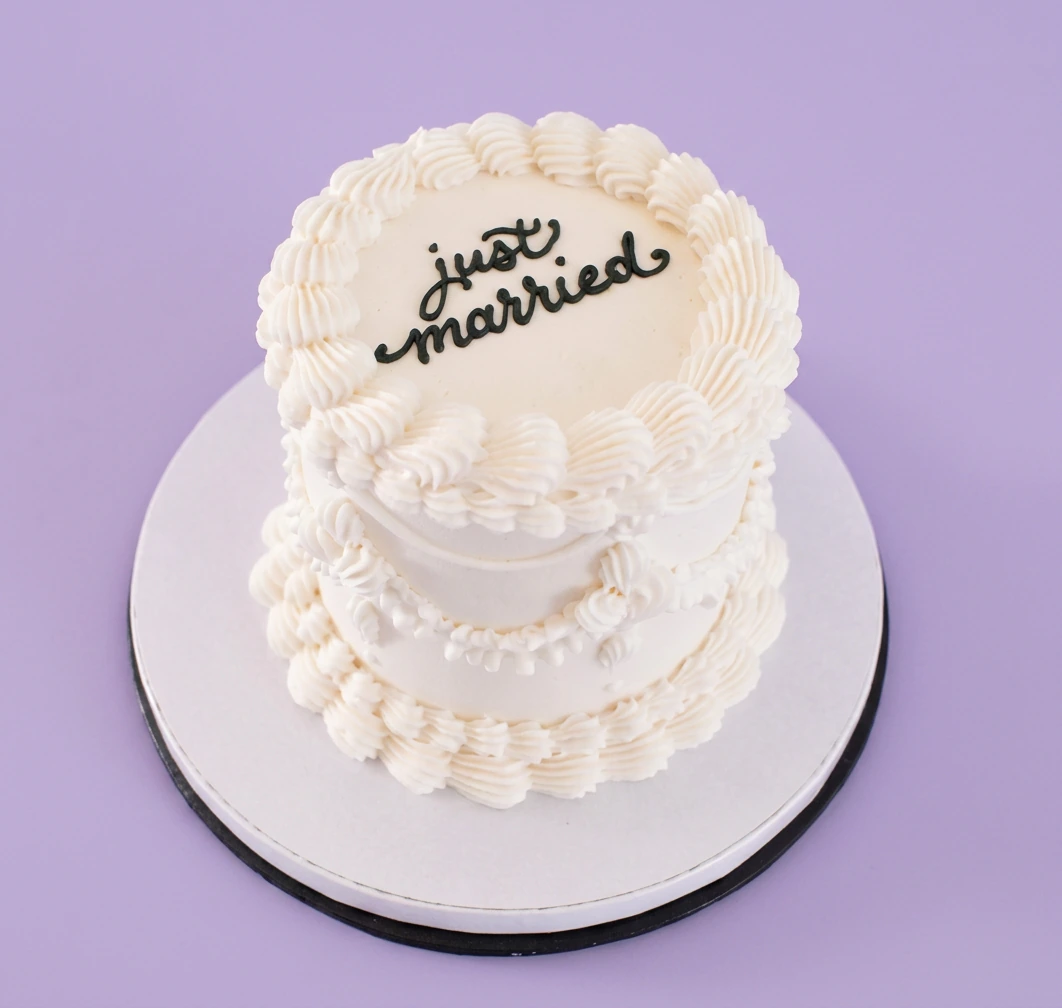 White minimalist vintage wedding cake with piped icing ruffles and black 'just married' text on top.