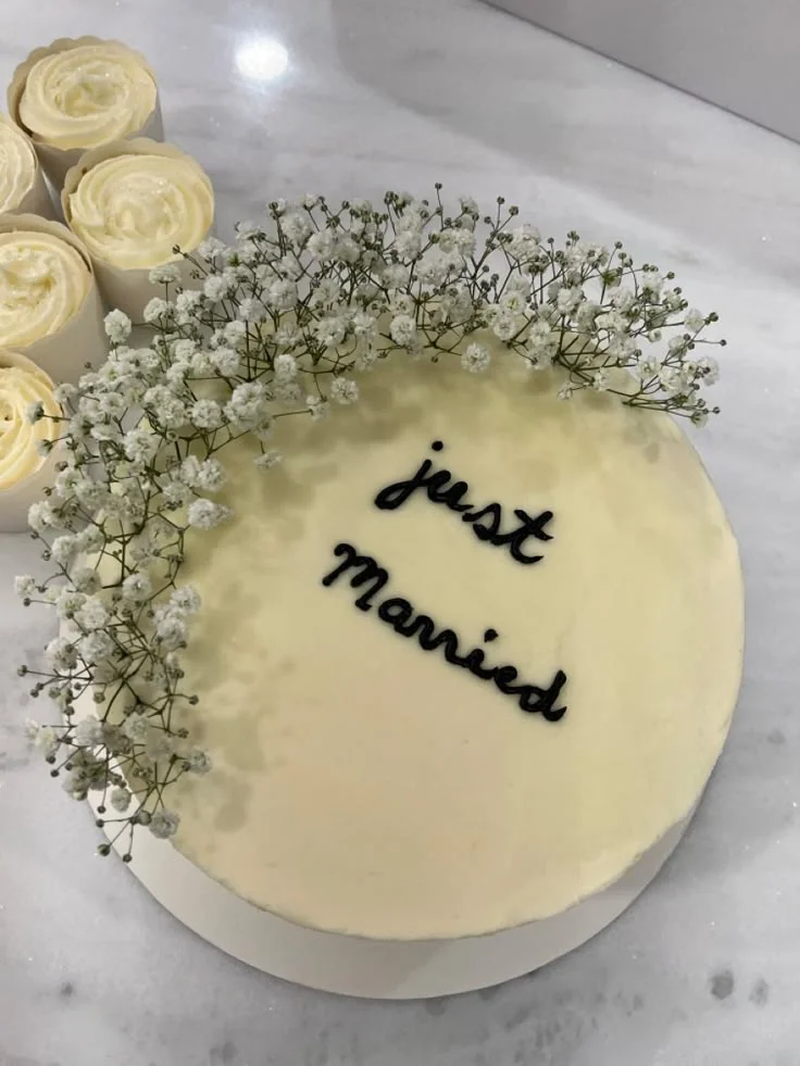 Minimalist white wedding cake with fresh baby's breath flowers and black piped icing text reading just married.