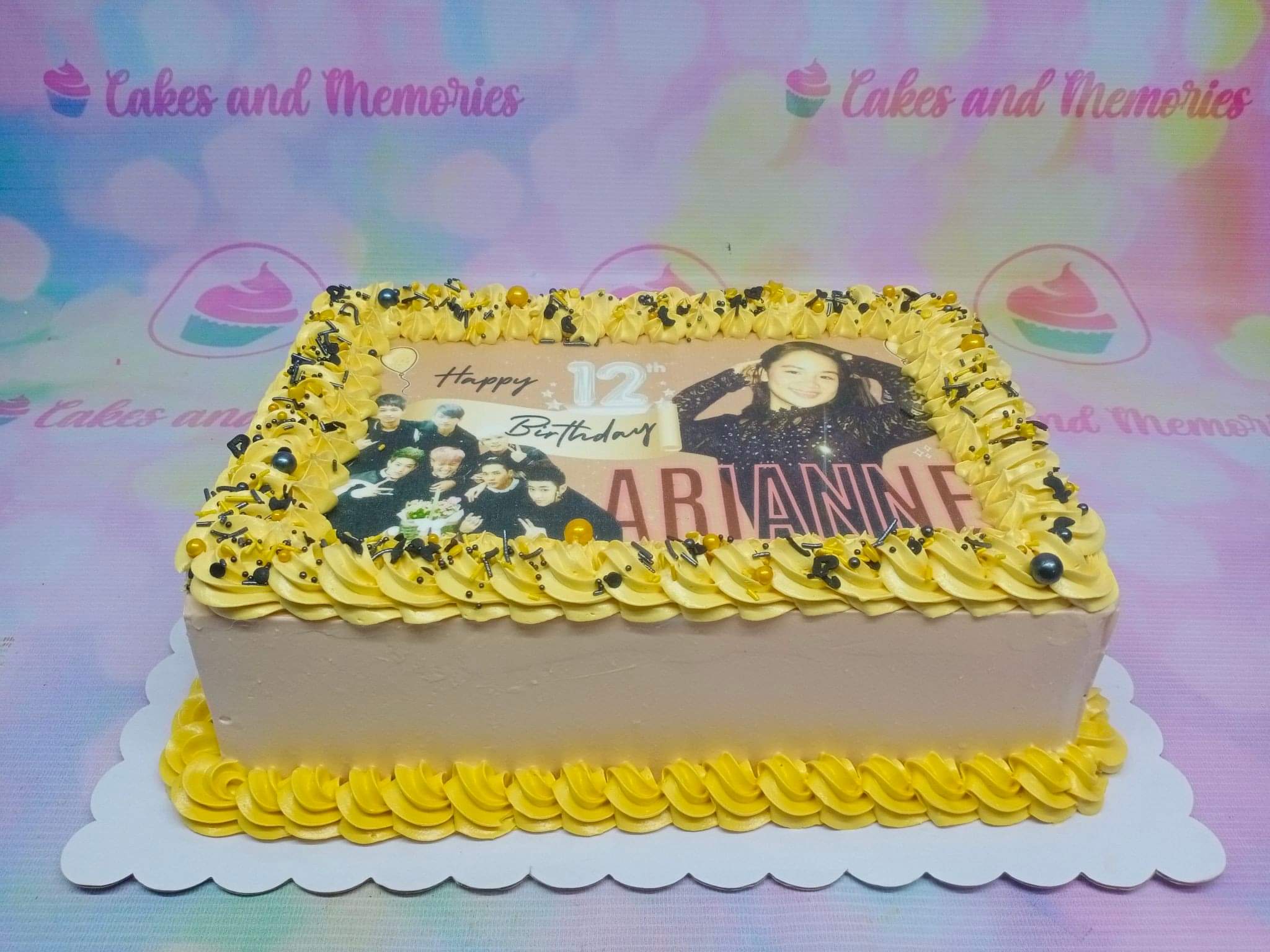 Rectangle birthday cake with yellow icing rosettes, black and gold sprinkles, and a large edible photo print of a girl and a K-pop group.