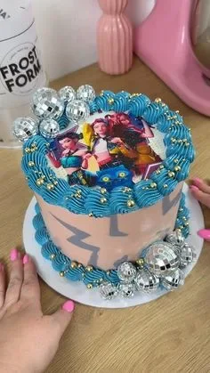 Pink and blue K-pop themed cake with a printed character topper, disco balls, and blue icing borders.