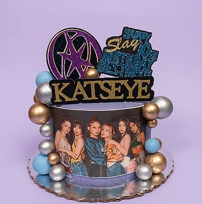 Katseye K-pop themed cake with group photo printout, purple logo, and gold, silver, and blue decorative balls.