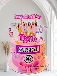 Pink 1-tier Katseye K-pop themed birthday cake with character printouts, musical notes, and a large pink bow.