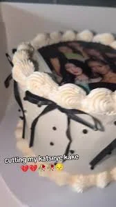 White vintage-style cake with black bows, black polka dots, and a printed photo of the K-pop group Katseye on top.