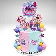 K-pop themed birthday cake with pink and light blue icing, featuring Buntrix and Saja Boys printouts and colorful plastic balls.