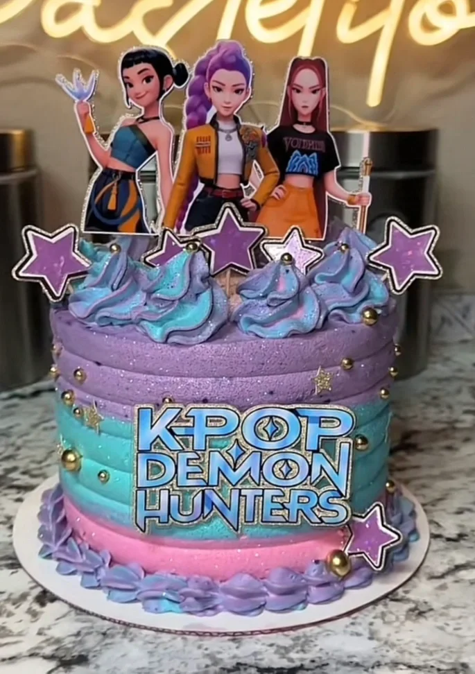 K-Pop Demon Hunters themed cake with purple, teal, and pink gradient icing, character printouts, and gold star accents.