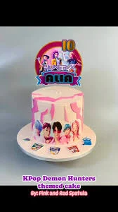 KPop Demon Hunters themed cake with pink and white textured icing and character printouts
