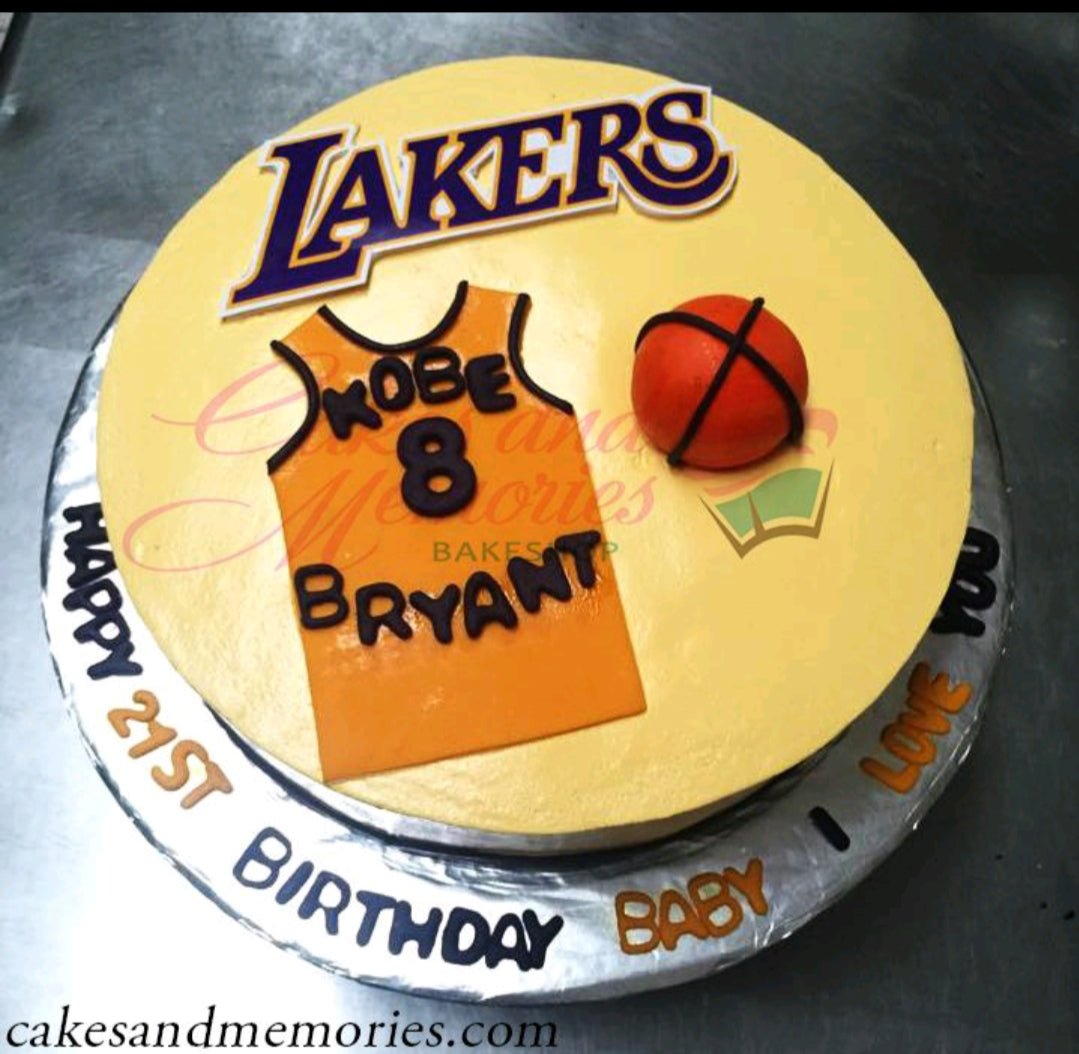 Yellow Lakers themed Kobe Bryant birthday cake with a fondant jersey and basketball topper.