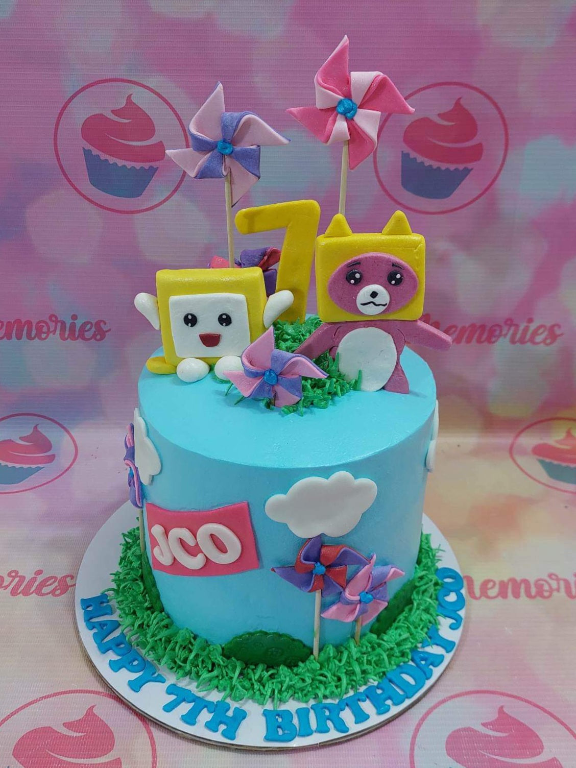 Light blue 1-tier birthday cake with LankyBox character toppers, colorful pinwheels, and green icing grass borders.