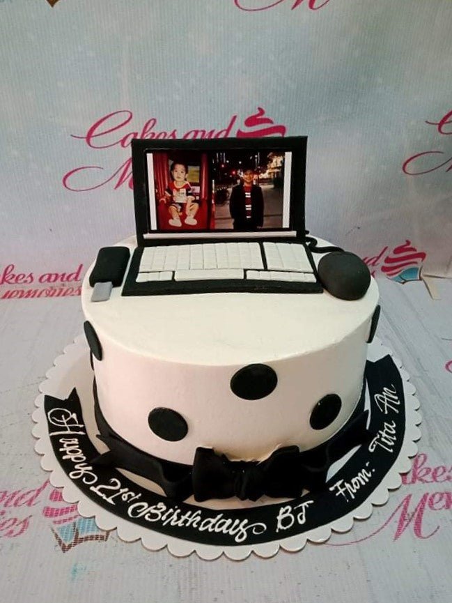 White 1-tier birthday cake with a black fondant laptop topper featuring photos, a mouse, and a USB drive.