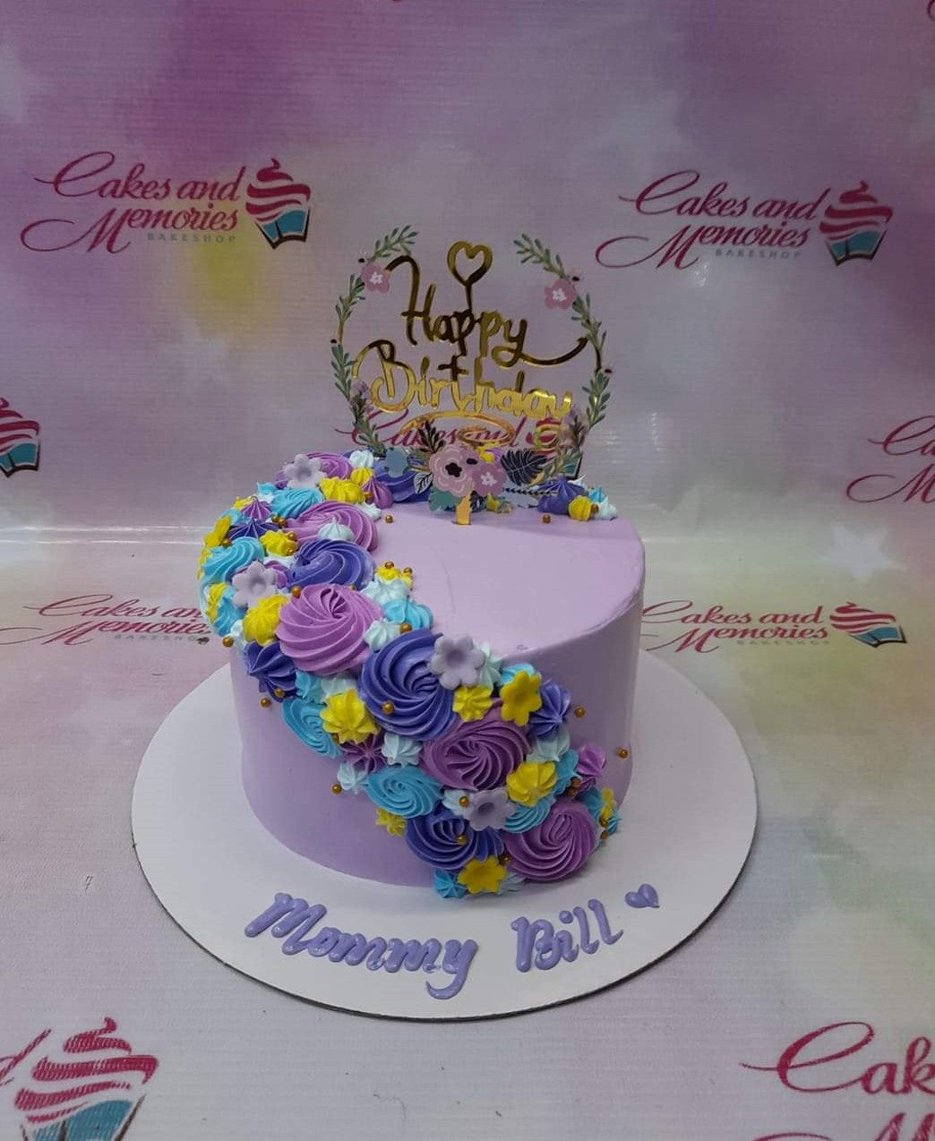 Lavender 1-tier birthday cake with a colorful swirl of purple, blue, and yellow icing rosettes and a gold Happy Birthday topper.