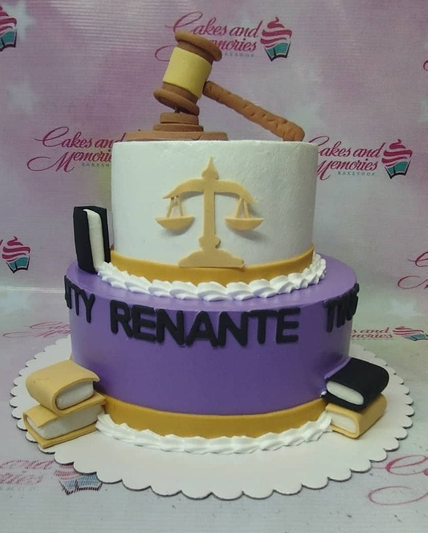 Two-tier law-themed cake in purple and white with a gavel topper, scales of justice, and fondant law books.