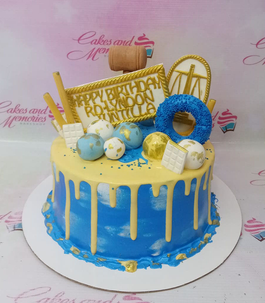 Blue and yellow lawyer themed cake with a gavel, scales of justice, and globe decorations.