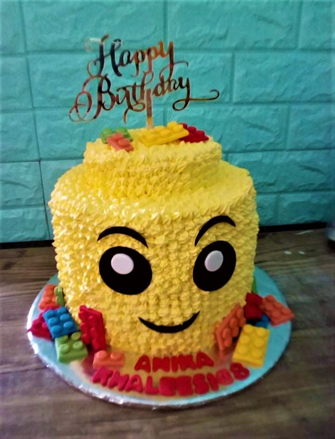 Yellow Lego head cake with textured icing, fondant Lego bricks, and a gold Happy Birthday topper.