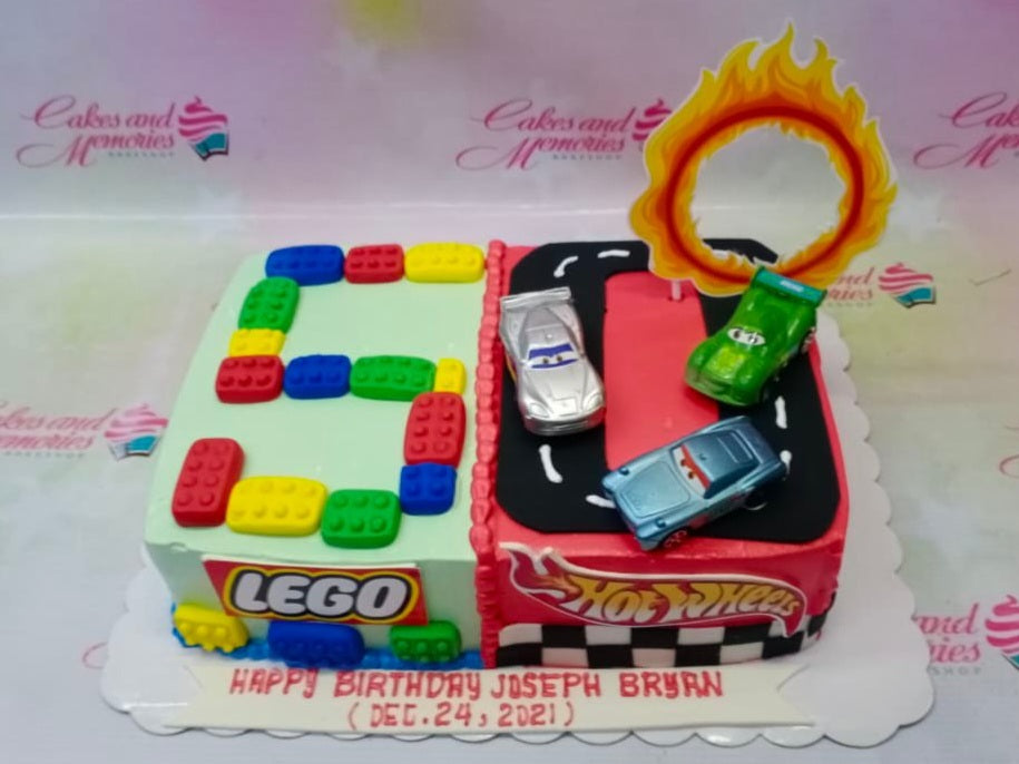 Split-design rectangle cake featuring Lego and Hot Wheels themes with toy cars, a fire ring, and colorful fondant bricks.