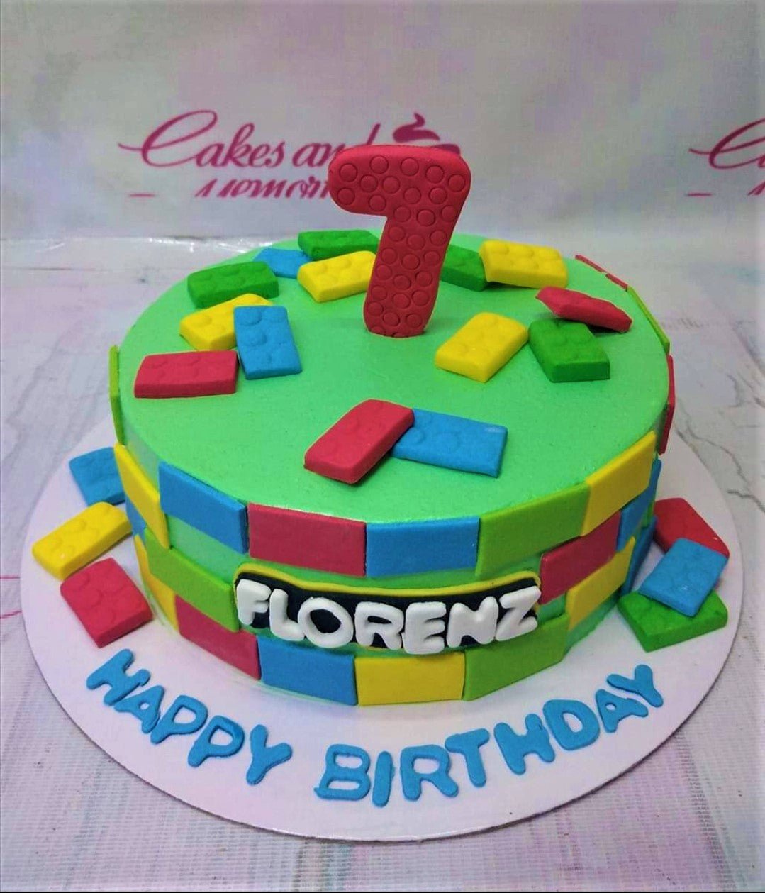 Lego themed birthday cake with colorful fondant bricks and a large red number seven topper on green icing.