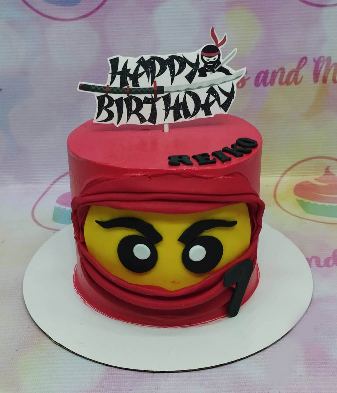 Red Lego Ninja themed birthday cake with a yellow ninja face and a Happy Birthday sword topper.