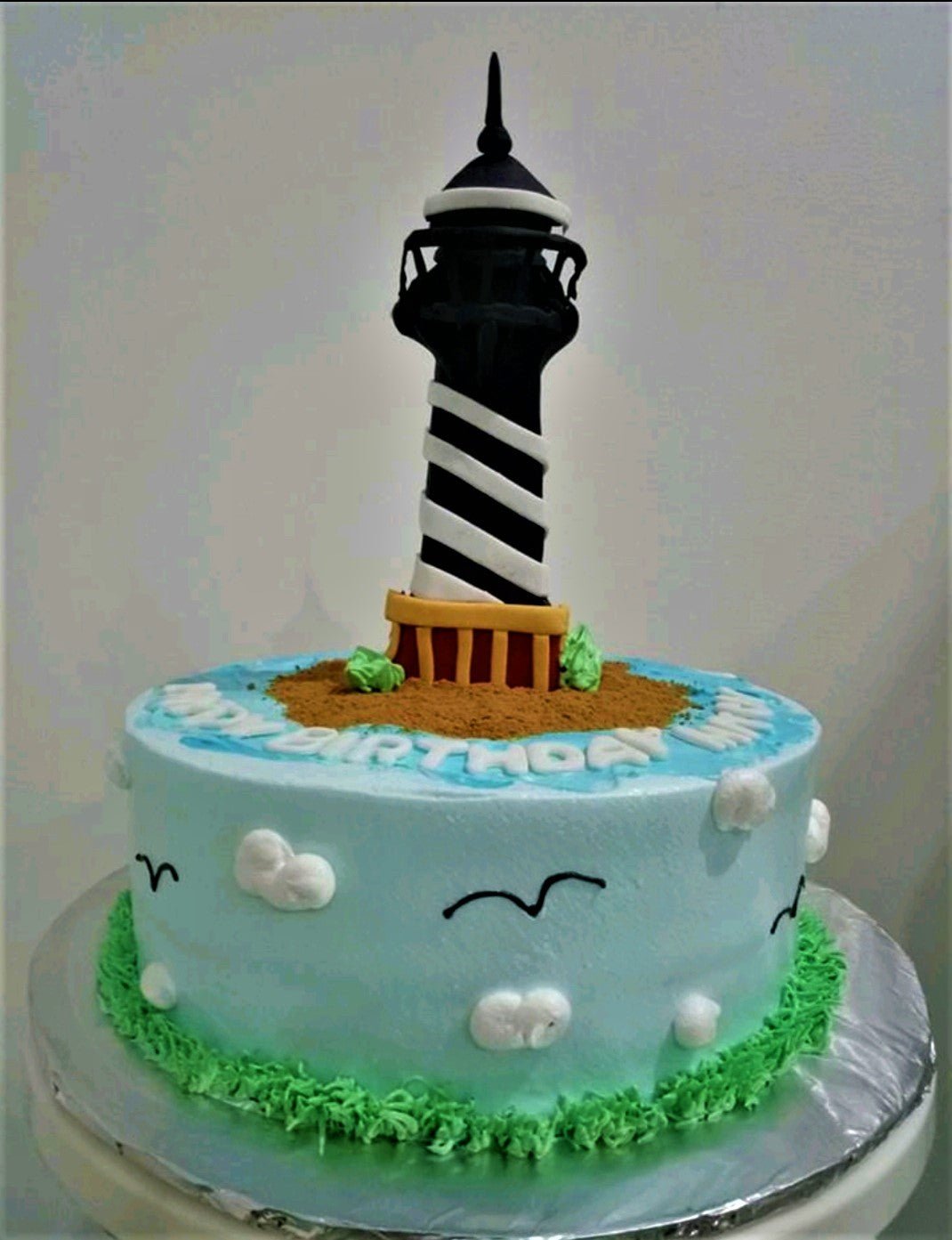 Light blue lighthouse themed birthday cake with a tall black and white lighthouse topper on a sandy island with piped grass and clouds.